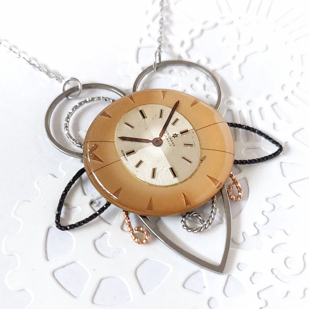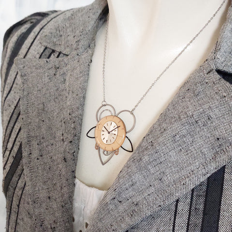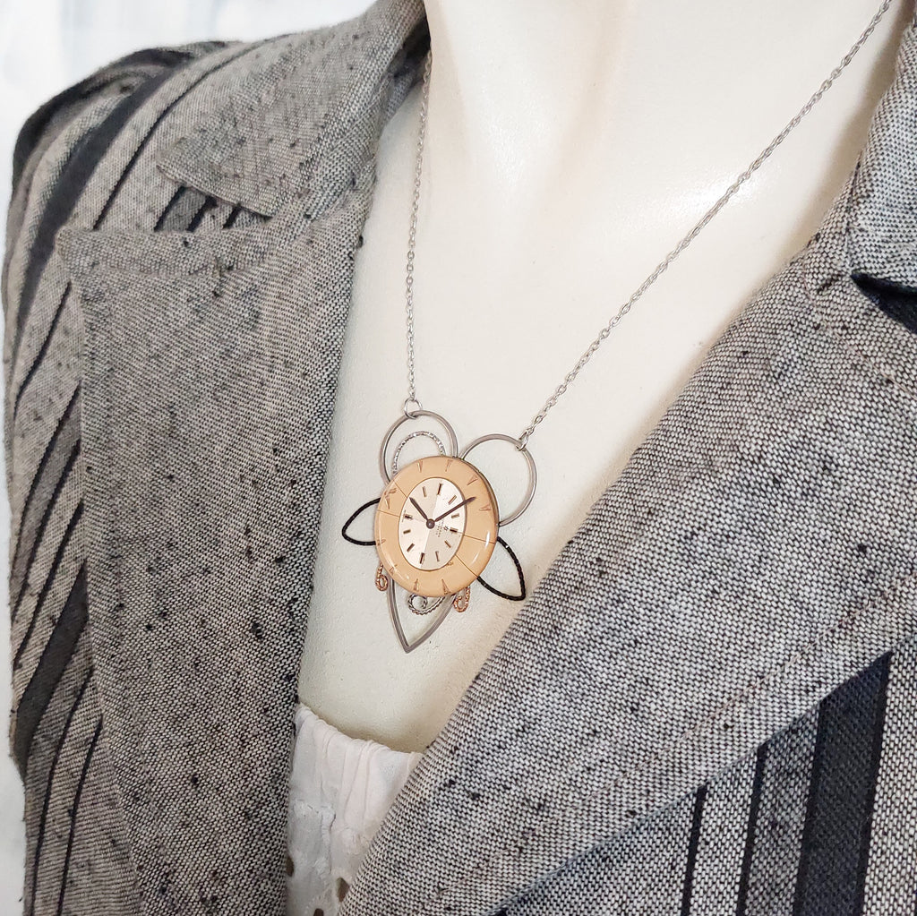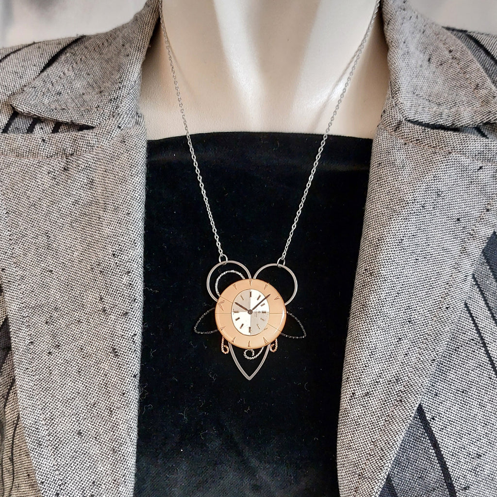 Impreziosito con ingranaggi di orologi e sveglie, lancette ed elementi metallici modellati a mano.
