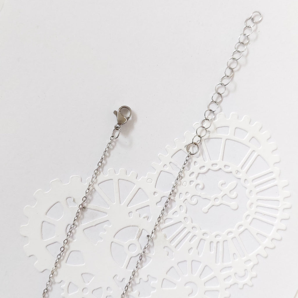 Composto da 2 differenti catene in acciaio, color argento, di cui una a maglie larghe, per consentire la regolazione della lunghezza.