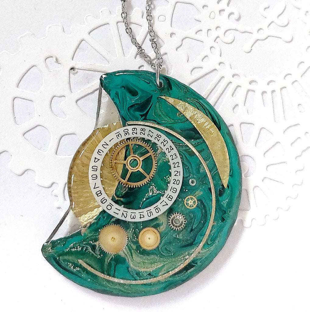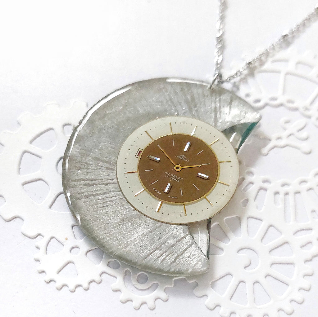Realizzato con quadranti vintage e decorato su entrambe le facce con smalti, datari, ingranaggi e lancette.